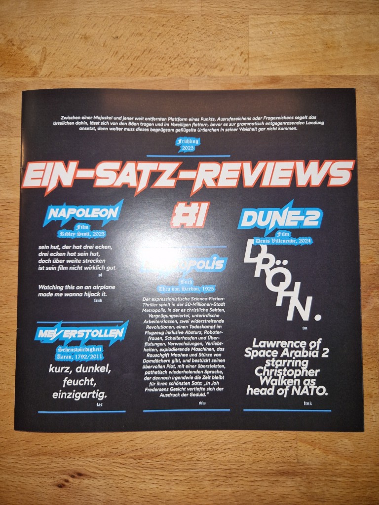 Gesucht sind Reviews, die nur einen Satz lang sind, für die nächste Ausgabe „Ein-Satz-Reviews“. Bei 100 Reviews wird es gedruckt.